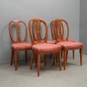 Set van vijf iepenhouten eetkamerstoelen met rode bekleding voorzien van geel bloemdecor met hekwerk, de ovale rug met gebogen spijlen samengebonden door band, de onderregel van vier stoelen gemerkt met initiaal 'W' welke hoogst waarschijnlijk staat voor Stadhouder Willem V (1748-1806) voor de inventaris van Paleis het Loo, en zijn verkocht in Den Haag op een veiling in 1796 en 1798, Louis Seize -herstellingen-, 98 × 50 × 39 cm