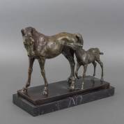 Gepatineerd bronzen beeld: merrie met veulen, op de voet gesigneerd Barye maar niet van de hand van Alfred Barye, laat 20e eeuw, 34,5 × 44,5 18 cm
