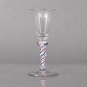 Slingerglas met slinger in rood, wit en blauw, de stam met twee knopen, 18e eeuw -chip van voet, kelk mogelijk opnieuw aangezet-, hoogte 16 cm