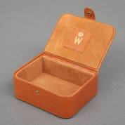 Klein bruin lederen juwelendoosje met suède binnenkant, in het deksel een gekroonde W, vermoedelijk voor koningin Wilhelmina, 4,5 × 11,5 × 9 cm
