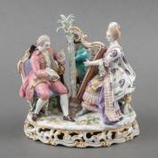 Porseleinen beeldgroepje: musicerend elegant gezelschap, Meissen, 19e eeuw, gemerkt in onderglazuur blauw en genummerd D48 -kleine defecten-, hoogte 20 cm