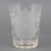 Gegraveerde glazen druivenspoeler met decor van een familiewapen en een VOC duit uit 1794 met het wapen van Utrecht in de bodem, 18e/19e eeuw, 15 × Ø 11,5 cm
