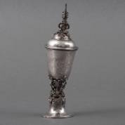Kleine verzilverde dekselcoupe op rijk bewerkte voet, het geheel met decor van Bijbelse voorstellingen, 19e eeuw, hoogte 17,5 cm