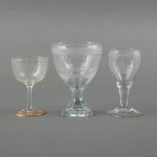Drie geslepen gelegenheidsglazen: één met decor landhuizen en hond waarboven een opschrift 'Marque D'Amitié, eerste kwart 19e eeuw -schilfertje van voet-, hoogte 13,2 cm, één met bloemdecor en gouden band om voet, deze band met inscriptie '10 julij 1813-1823', en één met bloemdecor en inscriptie 'B.D.S.'