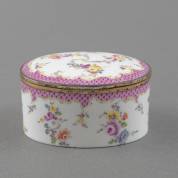 Ovaal porseleinen dekseldoosje met beschilderd bloemdecor en verguld zilveren montuur, niet gemerkt, uitvoering Meissen, tweede helft 18e eeuw, 4,5 × 8 × 6,5 cm