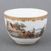 Amstel porseleinen kommetje met polychroom decor van figuren op het water met dorp in het verschiet, gemerkt in onderglazuur blauw Amstel en ingekerfd L3, 1784-1814 -haarlijn-, 5 × Ø 7,3 cm