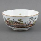 Amstel porseleinen spoelkom met polychroom decor van figuren langs het water met dorp in het verschiet, gemerkt in onderglazuur blauw Amstel een ingekerfd L3, 1784-1814 -verkleuring langs onderrand en gerestaureerde ankervormige haarlijn 7,5 × 8 cm-, 10 × Ø 21,4 cm, herkomst: Mazereeuw Antiquair, Amsterdam