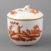 Amstel porseleinen dekselkom met sepiadecor: figuren in landschap, het deksel bekroond door eikeltje, gemerkt in onderglazuur blauw Amstel en ingekerfd L:2, eind 18e eeuw -haarlijn-, 11 × Ø 10 cm