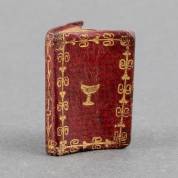 Miniatuurboekje: 'Le petit chanteur, almanach pour 1819'. Paris, Louis Janet, (1818). Rood lederen bandje uit de tijd, vergulde guirlande rond de platten, rug verguld. Met acht gegraveerde plaatjes -voorste buitenrand en hoeken omgekruld-, 29 × 18 mm