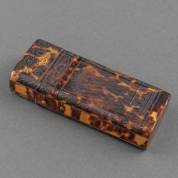 Schildpadbelijmde sigarenkoker met reliëfdecor van raamwerken en andere motieven, 19e eeuw -deksel heeft een klein beetje speling-, 13 × 5 × 3 cm
