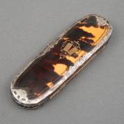 Schildpad brillenkoker met 2e gehalte zilveren beslag en onedele bril, 19e eeuw -deukjes-14,4 × 4,5 × 1,7 cm