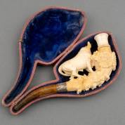Meerschuim pijp in de vorm van een stier met hoornen horens, met 1e gehalte zilveren manchet en barnstenen mondstuk, Engeland, 19e eeuw, 7,5 × 19 cm, in foedraal