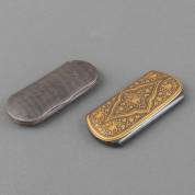 Twee kleine brillenkokers: één met niello blokjesdecor, brutogewicht 85 gram, interne breedte 11 cm, en één van gezwart ijzer met verguld reliëfdecor: draken en bladranken, interne breedte 12 cm