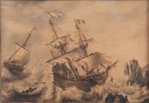 Hollandse School: schip slaat op de klippen, sepia en aquarel op papier, 17e-eeuwse stijl, l.o. onduidelijk gesigneerd en gedateerd 18[?]9 -gefixeerd scheurtje, gebruind-, 16 × 23 cm