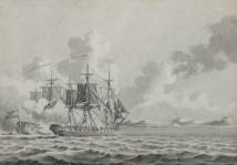 Toegeschreven aan Peter Morellon la Cave (1765-na 1812), gevecht tussen het Hoeker schip 'De Vrouw Machtelyna' en het Engelse fregat 'De Diamant' voor de kust van Curaçao, 1782, gewassen inkt op papier, niet gesigneerd, tekening in print gebracht door Carel Frederik Bendorp, 16,5 × 23,5 cm