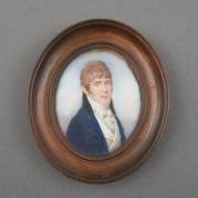 Ovaal miniatuurportret: Henri Jolivet (1775-1817) in blauwe overjas, aquarel, 8 × 6 cm