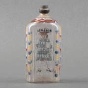 Glazen muizenflesje met emaillebeschildering, decor van man met tricorne en glas, en verso spreuk 'Guten Brandewein und gutes Bier trinct ich gern und habs beij mir', 18e eeuw -stopje ontbreekt-, 14 × 6,5 × 5 cm