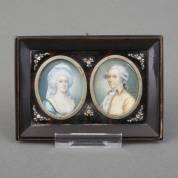 Claude Bornet (1733-1804), twee portretminiaturen van man en vrouw, beide r.o. gesigneerd en gedateerd 1784, samen in schildpad lijst ingelegd met parelmoer bloemdecor, elk 3,5 × 2,5 cm