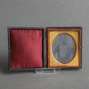 Ambrotypie: portret van een oudere militair, knopen en epauletten verguld, binnen een verguld passe-partout, in een lederen foedraal, 9,5 × 8 cm