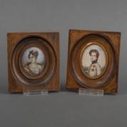 Twee miniatuurportretjes in lijst: vrouw en jonge man, beide onduidelijk en afwijkend gesigneerd, mannenportret inclusief lijst 15 × 12,8 cm