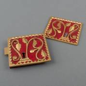 Rood- en goudgelakt messing slot met slotplaat -géén sleutel-, 12,5 × 13,5 cm