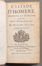 Twee delen: Homère. L'Iliade. Trad. en françois, avec des remarques, par Madame Dacier. Paris, Rigaud, 1711. 3 delen. LXXII, 522 (2); 622; 616 (6) pp. Kl. 8vo. Perkament. Met titelprent en 25 platen -defect aan rug van deel 1; perkament van een ander deel gevlekt-