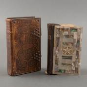 Twee kleine boekbanden: 1) Blindgestempelde lederen band, 2 metalen klampsluitingen, 48 kleine knoppen en kantbeslag (over een Gebedenboek 1844), 2) platten met marqueterie inlegwerk van parelmoer, lederen rug (over een bijbeltje, 1980), 17 × 10 cm