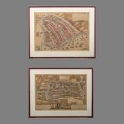 Ingekleurde gravure: 'Nobile Inferioris Germania', plattegrond van Amsterdam, uitgegeven door Braun en Hogenberg, 1572, daarbij plattegrond van Utrecht: 'Traiectum clara et vetus est Episcopalis Civitas', uitgegeven door: Braun & Hogenberg, circa 1580 -gaten in de plattegrond van Utrecht-, Amsterdam gemeten 35 × 49 cm