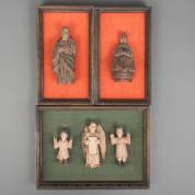 Vijf gesneden houten beeldjes, gemonteerd in drie lijsten, grootste lijst 28 × 38 cm