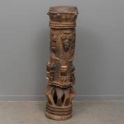 Grote staande Afrikaans houten trommel, gedecoreerd met mensen, slangen en krokodillen (Ganda Bumba), Kuba, Congo, afmetingen circa 128 × Ø 36 cm