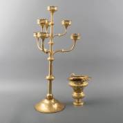 Messing zeslichts altaarkandelaar op ronde voet, en messing wijwatervat, kandelaar 80 × Ø 40 cm