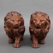 Paar gestoken eiken beelden: leeuwen met halsbanden, 19e eeuw, 23 × 43 × 13 cm