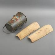 Hindelooper beschilderde metalen brandemmer met decor van molen aan het water, 19e eeuw, 46 × Ø 25 cm exclusief hengsel, daarbij: twee steengoed scheenbeschermers