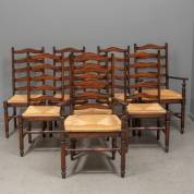 Acht donkergepatineerde eiken 'ladderback chairs' met biezen zitting, waarvan twee armstoelen, Engelse stijl, eind 20e eeuw