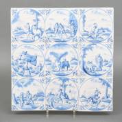 Negen aardewerk cirkeltegels met Bijbelse voorstellingen, samen in één tableau gezet, begin 18e eeuw, tableaumaat 39 × 39 cm