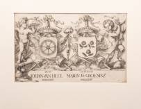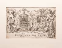 Gravure met twee familiewapens van de Rotterdamse burgemeesters Johan van Heel en Marinus Groenix, door Johannes de Vou, 1695, in passe-partout -vlekken in de marges-, 25,5 × 41,5 cm