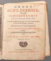 Boek: Lairesse, G. de. Groot Schilderboek, waar in de schilderkonst in al haar deelen grondig werd onderweezen, ook door redeneeringen en printverbeeldingen verklaard; met voorbeelden uyt de beste konst-stukken der oude en nieuwe puyk-schilderen bevestigd en derzelver wel- en misstand aangeweezen. Amsterdam, H. Desbordes, 1712. 2 delen in 1 band. (XVI) 434 (36); 400 (3) pp. 4to. Kalfsleer uit de tijd. Met gegraveerde titel en 64 platen -rug beschadigd, nieuwe schutbladen; (water)vlekken-