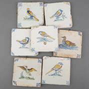 Zeven aardewerk tegels met polychroom decor: vogels, 17e eeuw -defecten-, 12,5 × 12,5 cm