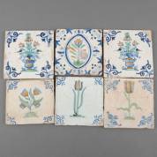 Zes aardewerk tegels met polychrome bloemdecors, 17e eeuw -randbeschadigingen-