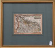 Ingekleurde gravure van de 17 Provinciën: 'A new map of Ye XVII provinces of low Germanie', door Pieter van der Keere, circa 1662, 9 × 13 cm