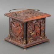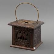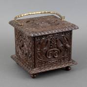 Gesneden eiken stoof met decor: twee duiven eten van dezelfde vrucht, 18e eeuw -deurtje gelijmd bij scharnierpunt-, 21 × 22,5 × 21 cm