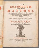 Boek: Til, S. van. Het Evangelium des H. Apostels Matthaei, na een bequame ontleding, kort-bondige aantekeningen, kragtige demonstratien, tegen alle on-christenen en twijffelaars betoont. 4de druk, verb. en vermeerdert. Dordregt, D. Goris, 1703. (XLVIII) 854 (28) pp. 4to. Perkament -band gevlekt-