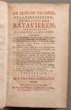 Boek: Schelling, P. van der. De aloude vryheid, staatsregeerig, en wetten der Batavieren; vergeleeken met die van laater tyden. Rotterdam, 1746. (IV) CXXXII, 680 pp. Perkament.