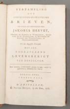 Twee delen: Hervey, J. Verzameling der godvruchtige en stigtelyke brieven. Uit het Engelsch vertaeld. Met een levensberigt van denzelven. Tweede druk. Amsterdam, 1768. 2 delen. CXCVI, 312; (II) 412 pp. Kalfsleer uit de tijd. Met portret van de auteur