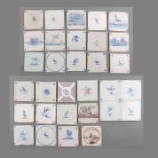 Dertig blauwe en mangaanpaarse aardewerk tegels met vogeldecors, waarvan vier in een tableau gezet, 17e en 18e eeuw -randbeschadigingen-