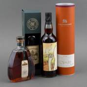 Vier diverse flessen cognac: 1. A. de Fussigny Extra; 2. Hine Napoleon; 3. een 30 jaar oude, gedestilleerd door Distillerie Charpentier, gebotteld door Cadenhead's in 2019; 4. een 31 jaar oude, gedestilleerd in Frankrijk, 1989, gebotteld door Thompson Brothers -vulniveau's in orde-