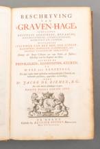 Drie delen: Den Haag - Riemer, J. de. Beschryving van 's Graven-Hage, behelzende deszelfs oorsprong, benaming, gelegentheid, uitbreidingen, onheilen en luister. Mitsgaders de stigtinge van het Hof, der kerken, kloosters en andere voornaame gebouwen. Als mede de privilegien, handvesten, keuren etc. 's Graven-Hage 1730-1739. 2 delen. In 3 banden. (XXXVIII) 946 (54); (XII) 520, 78 (20) pp. Folio. Met titelprent, 2 gegraveerde opdrachtbladen en 56 platen: 8 grote uitslaande prenten (waaronder een panorama van Den Haag, metende 48 × 98 cm) de andere prenten meest over 2 pagina's -banden gevlekt en stoffig; gebruind, enkele scheuren in de gevouwen platen-