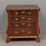Wortelnotengefineerde orgelgebogen commode, met vier laden en messing beslag, rustend op klauwpoten, 18e eeuw -restauraties en wat fineerschade aan bovenblad-, 82 × 77 × 49 cm