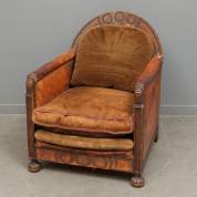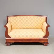 Mahonie houten bankje met gebogen rug en armleuningen, staande op bladvormige poten, circa 1830, 90 × 140 × 64 cm