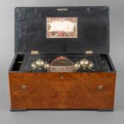 Zwitserse cilinderspeeldoos met vier melodieën, trommel en zes bellen, de linkerzijde met geïntegreerde hendel, in wortelnoten kast, tweede helft 19e eeuw -mist drie tanden, speelt-, 25 × 58 × 29,5 cm